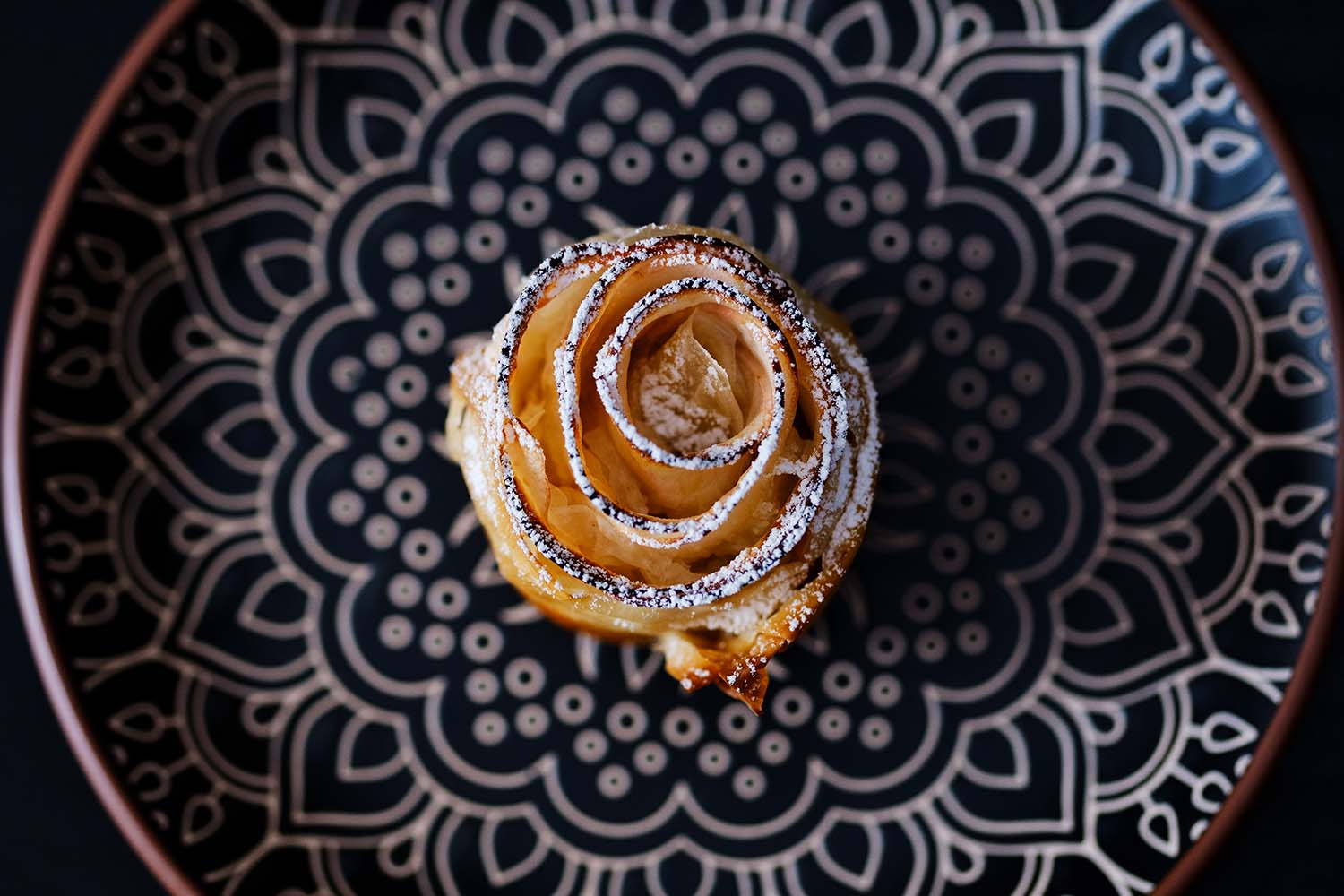 Omenaruusun tein filotaikinasta ja väliin laitoin kotipihan omenoiden lisäksi mantelia sekä vähän sokeria. Edellisestä omenaruusujen leipomisesta onkin ehtinyt vierähtää joitakin vuosia, joten muutaman harjoittelukappaleen totesin näyttävän siltä, että ne oli syytä tuhota nopeasti ja syödä pois (ei ollenkaan huono vaihtoehto sekään). Tavoitteena oli saada leivottua ja tehtyä kuvat valmiiksi vielä samana päivänä. Ehkä tämä kertookin valokuvauksen monipuolisuudesta, kun päivään voi sisältyä ideointia, rekvisiitan hakemista kirppareilta, värien ja tunnelmien suunnittelua, kuvauspaikkojen etsimistä, leipomista tai muuta konkreettista valmistelua, kuvaamista, kokeiluja, kuvien käsittelyä ja paljon muutakin.